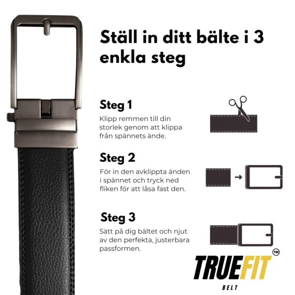 TrueFit Belt™ levereras 130 cm långt och passar midjemått upp till 120 cm. Du klipper bandet vid spännet en gång för att anpassa längden, sedan sköter den mikrojusterbara skenan finliret. Kroppen förändras – bältet fortsätter passa.