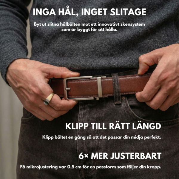 Ett läderbälte utan hål, med mikrojustering längs hela midjan, så du alltid kan hitta exakt rätt läge – inte nästan, utan perfekt.